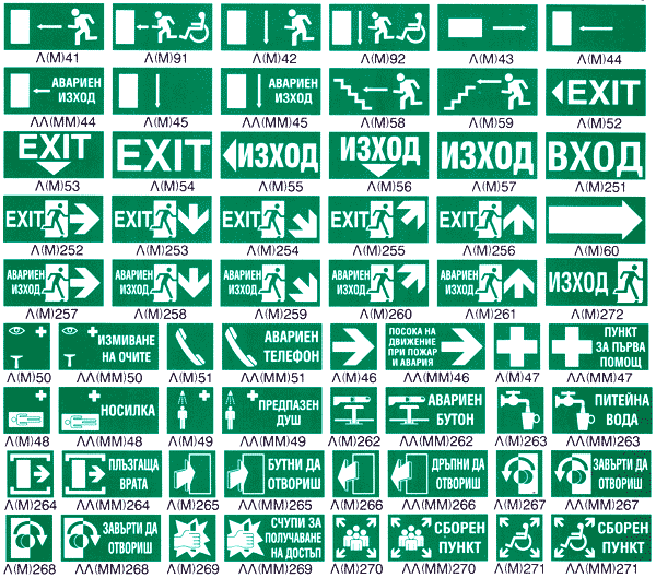 Всички знаци за аварийни изходи и противопожарно оборудване се изработват и от